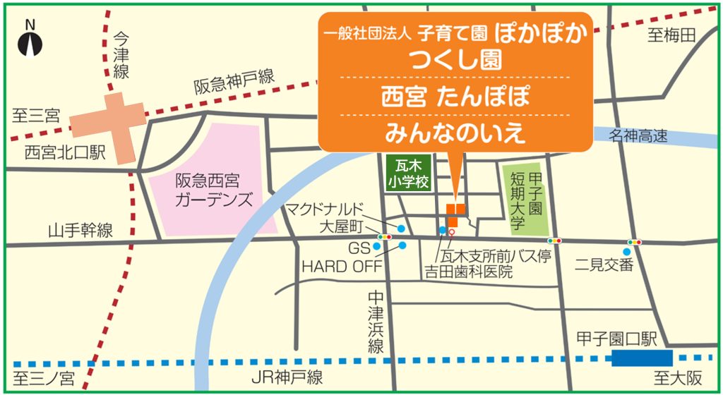 | 2011年 | 西宮市瓦林町に移転 「子育て園 ぽかぽか」と改名 市の要請を受け、0〜3歳児を受け入れるため、 3施設に増設「つくし・すみれ・れんげ」 |