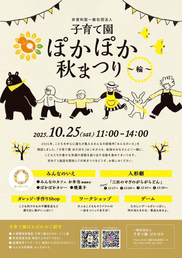 気候も心地よいこの実りの季節に、こどもたちを囲んで、みなさまと穏やかで豊かな時間を過ごしながら、お越しくださったみなさまにとっても温かな出会い・交流の場となり、笑顔がひとつ膨らむ日となれば幸いです。