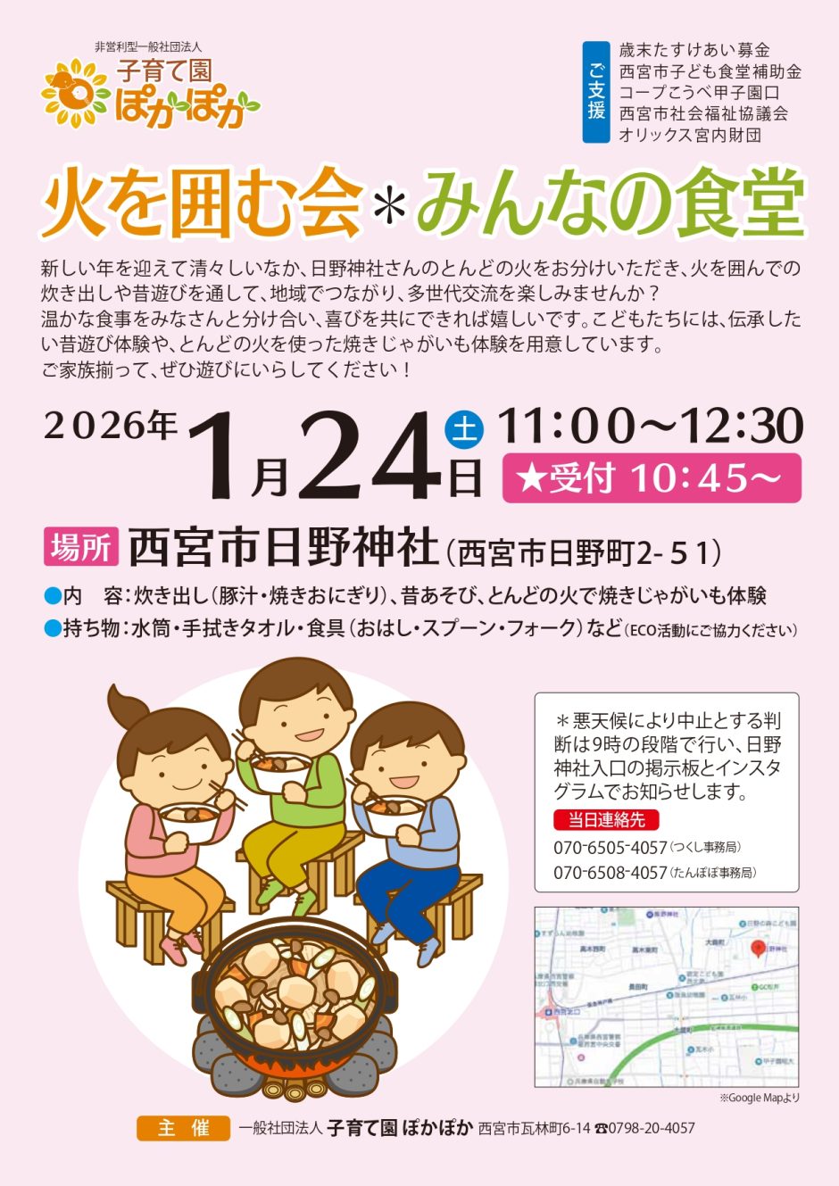 1月の「みんなの食堂」は、新年らしく、日野神社の境内をお借りして、1/24(土)11:00~12:30 に開催します♪