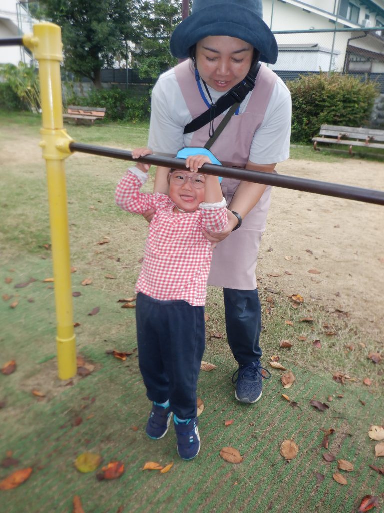 いつも遊びに行く公園ですが、「早くお弁当食べたい!」ととても楽しみにしていました。公園ではどんぐりがたくさん落ちていて、みんなでどんぐり拾いをしたり、遊具やボール、長縄で綱引きをしたり、思い思いに遊びました。
